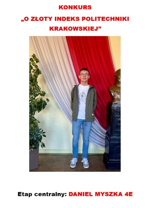 - DANIEL MYSZKA 4e – etap centralny Konkursu „O Złoty Indeks Politechniki Krakowskiej” / matematyka (Daniel jest już szczęśliwym studentem PK )